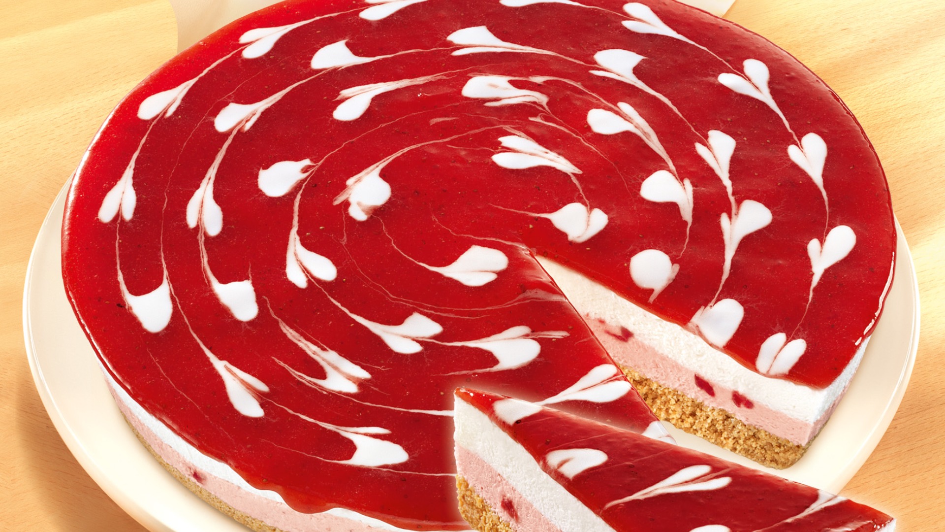Lækre og velsmagende cheesecakes med sprød crumblebund, cremet mousse med friskost og frugtstykker, smukt dekoreret med frugtgelé i flot mønster.