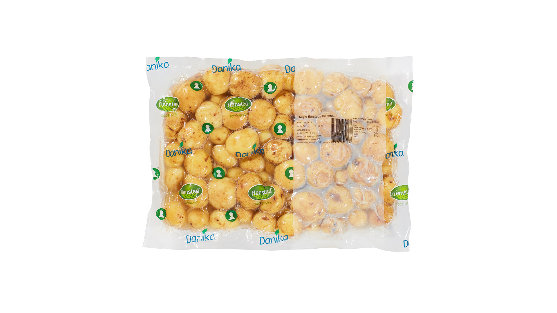Danskproducerede og danske kartofler med skræl, kogte og af gule sorter. Sorteret efter størrelse 35-45 mm, som måles over maven på kartoflen. Børstede kartofler skrubbes mildt for at fjerne lidt af skindet, hvilket giver dem et udtryk i stil med nye kartofler. Vægt angives som nettovægt, hvor der kan være forskel på hvor meget vand kartofler afgiver i posen under produktionen. Det meste af dette vand optages af kartoflen igen ved opvarmning i posen. Server fx som kogte kartofler, braiserede, kolde i kartoffelsalat eller vend i olie og steg hele i ovn.