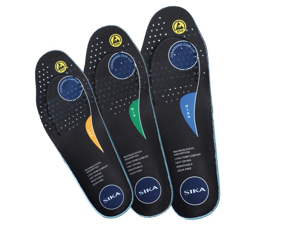 Eksklusiv og svangstøttende indlægssåler, der er konstrueret for optimal støtte og komfort til fødder med lav svang. Sålen er af blødt, stødabsorberende og åndbart EVA/PU skum og formgivet med slidstærkt polyester omkring sålen for optimal holdbarhed. Under hæl er der indsat 3 mm Poron for ekstra god stødabsorbering. Sålen er antistatisk og ESD kompatibel. Kan klippes til – anvend eksisterende sål som skabelon for optimal pasform.