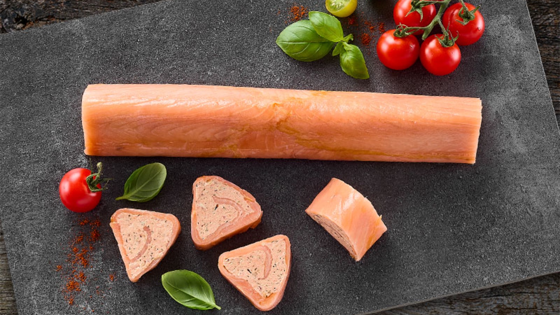 Håndlavet trekant af den fineste tørsaltede og koldrøgede laks med flødeost og rød pesto (tomat og basilikum)